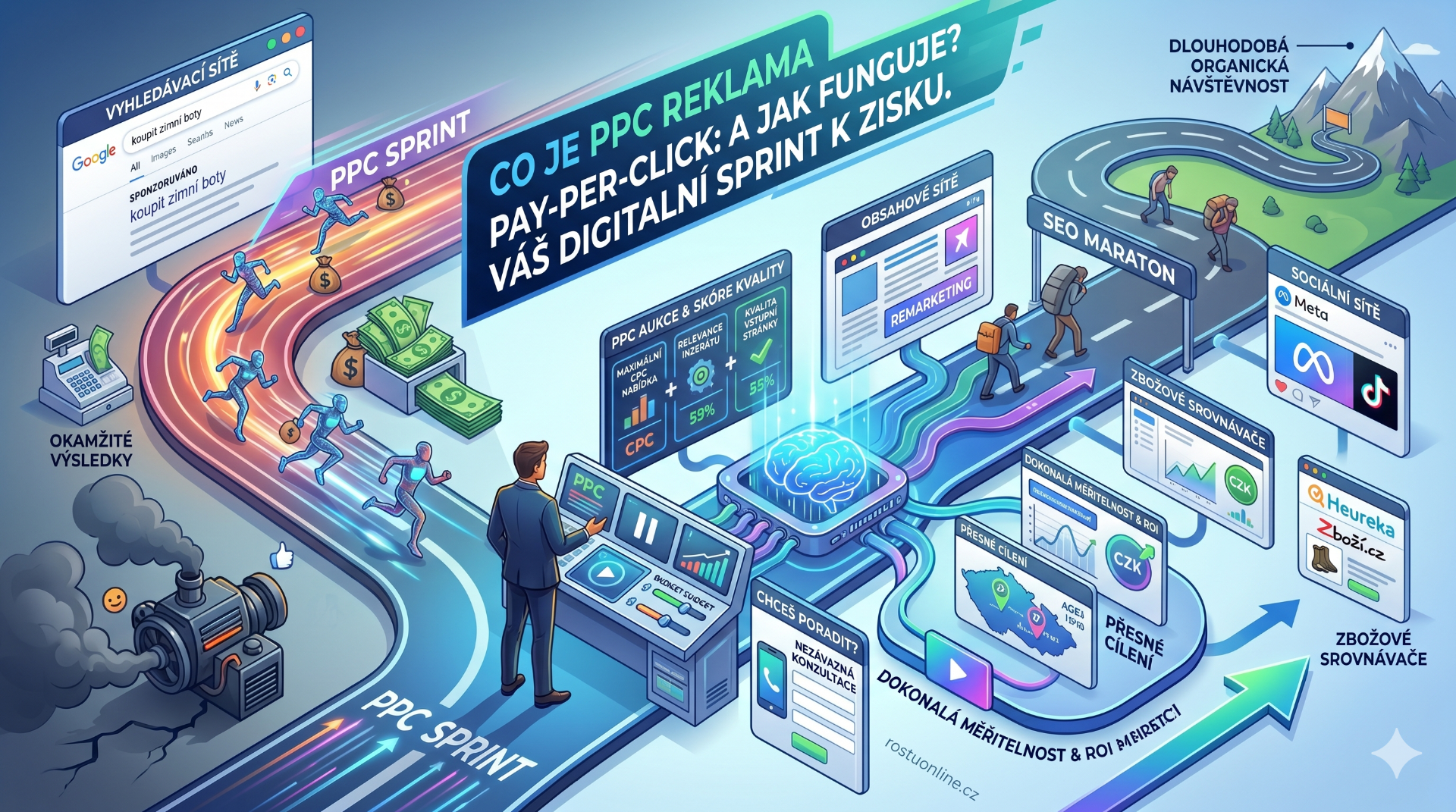 Zatímco PPC je sprint, SEO je maraton. PPC reklama přinese návštěvnost okamžitě, ale jakmile přestanete platit, přísun zákazníků se zastaví. SEO sice trvá dlouho a vyžaduje spoustu práce na obsahu a technickém stavu webu, ale z dlouhodobého hlediska přináší "bezplatnou" organickou návštěvnost.